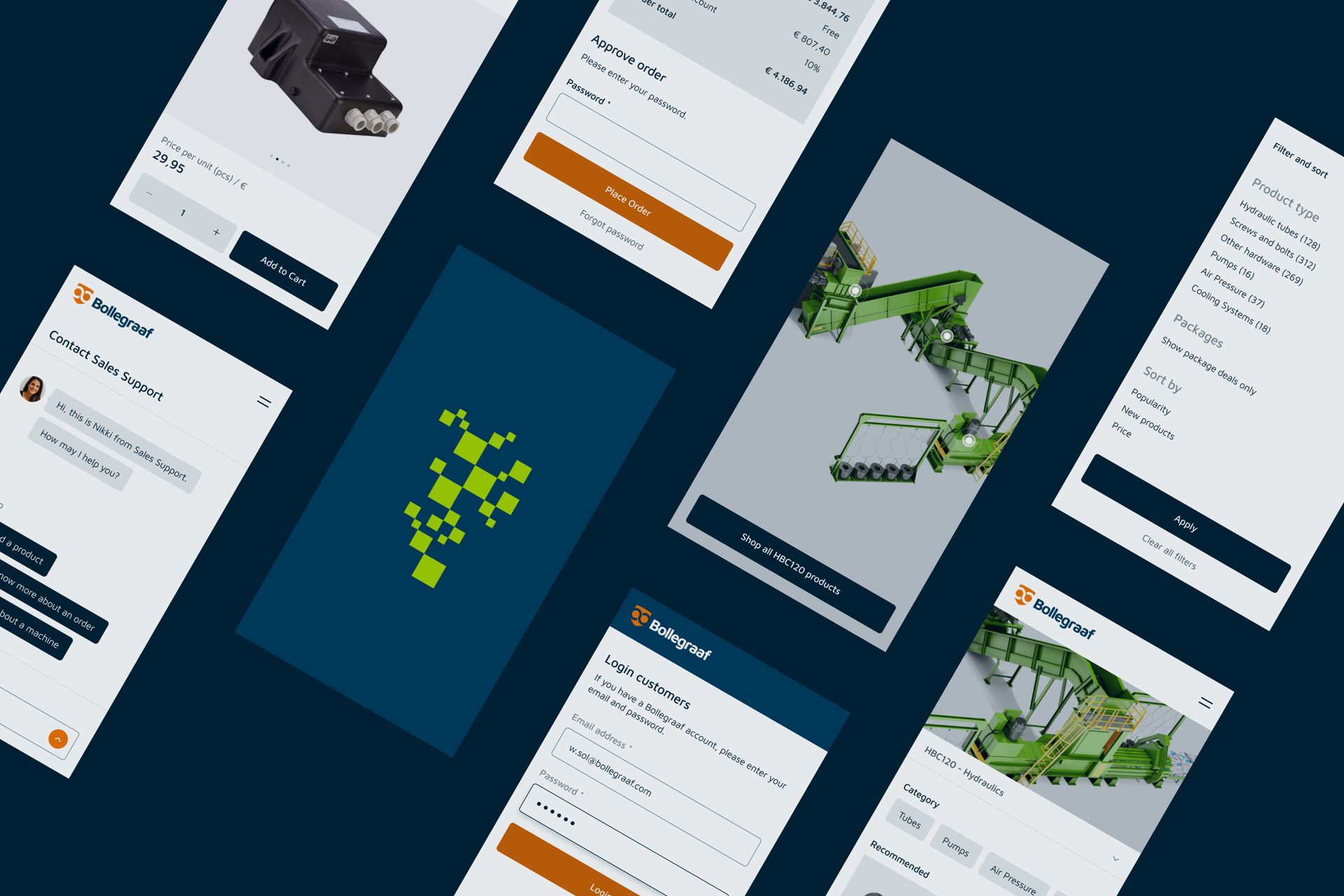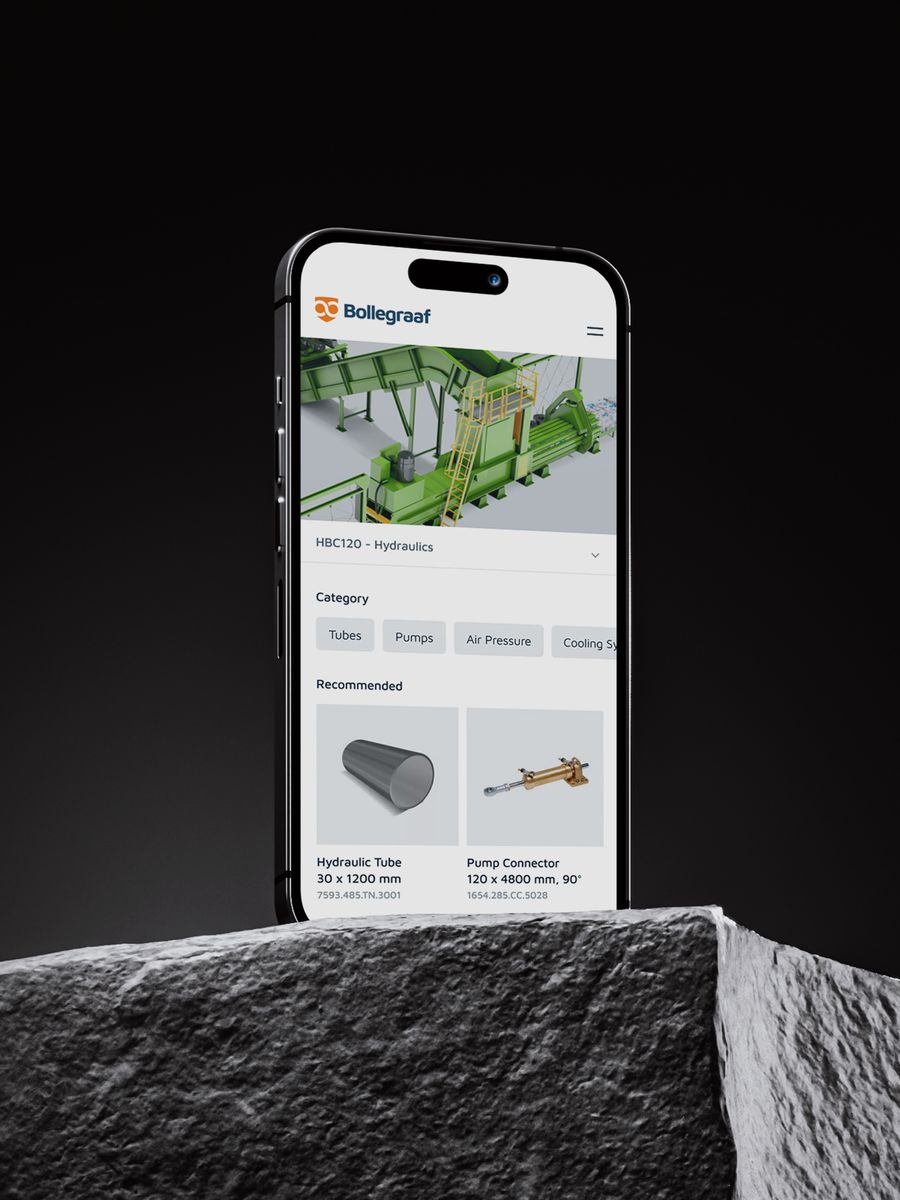 Bollegraaf Recycling Solutions is the international market leader in the field of recycling machines. With custom machines located at customers all over the world, solid after-sales and technical support is crucial. To make ordering spare parts easy, Basix developed a cross-device customer webshop.