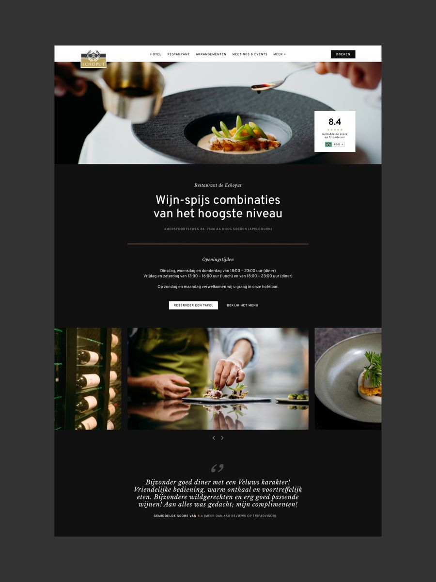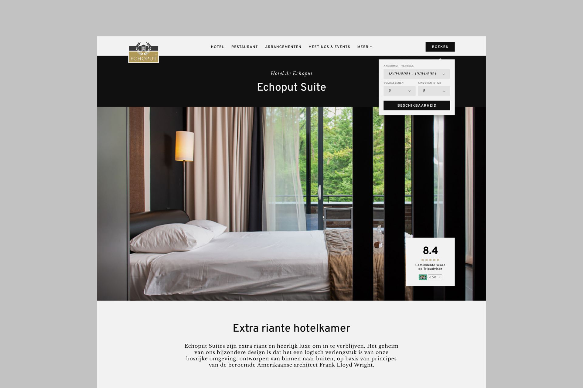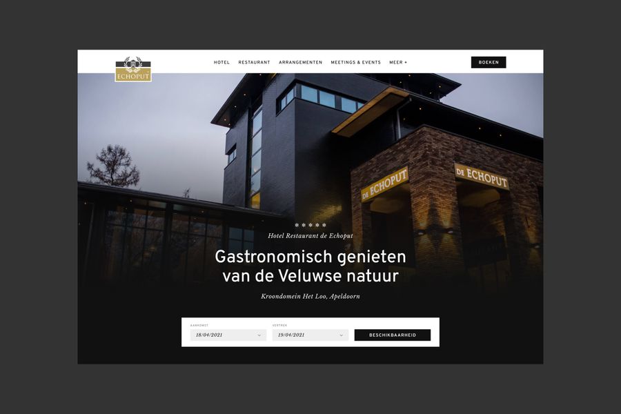 The 5-star Hotel de Echoput with top restaurant is located in the beautiful forests of the crown domain in the center of the Netherlands. The number of hotel bookings via their own website has fallen sharply in recent years. Research showed that this was due to poor navigation and information structure. The website was slow and had an outdated booking engine. As a result, visitors quickly dropped out.